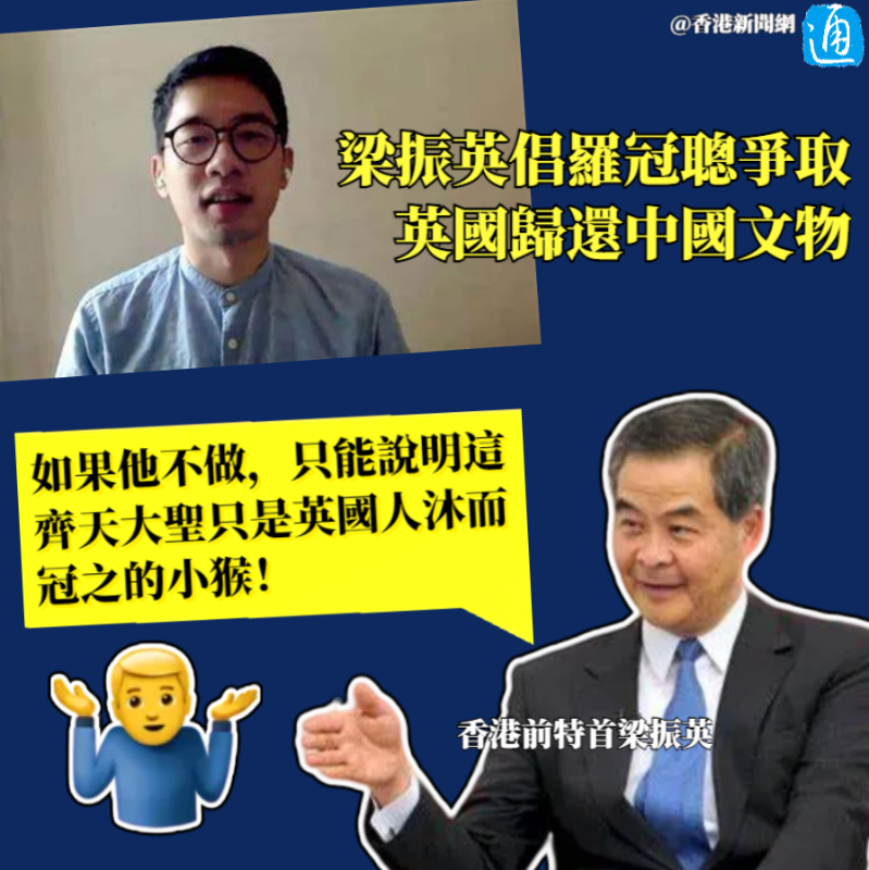 社交媒體截圖 眼見羅冠聰在網上呻吟不斷,梁振英亦給出建議,若他真想做個有“家(香港)國(中國)情懷”的人,與其鸚鵡學舌,不分早午晚,開口就是“哈囉早晨”,不如為洗白英國出點力,爭取讓英國人早日歸還侵佔中國的文物。 英國人手上的中國文物絕大部分都是賊贓,而除英國外,世界各地的博物館和私人收藏家紛紛將賊贓文物歸還給所屬國家。梁振英在帖文中揶揄,如果羅冠聰認為英國人會聽他的,應盡快發起佔領大英博物館行動,迫使英國政府修改法律,將賊贓藏品物歸原主。 “如果羅冠聰爭取成功,護送英國人手上所有賊贓文物來港歸國,將功贖罪,我們要去赤鱲角機場給他英雄式歡迎,”梁振英續說,還會替他向法庭寫求情減刑信。如果英國人討價還價,香港還可以授權羅冠聰送走英國丟在香港的維多利亞女王和喬治五世的銅像。 梁振英在帖文最後一針見血地指出,羅冠聰很有條件做爭取英國人歸還文物的工作,“如果他不做,只能說明這齊天大聖只是英國人沐而冠之的小猴!”