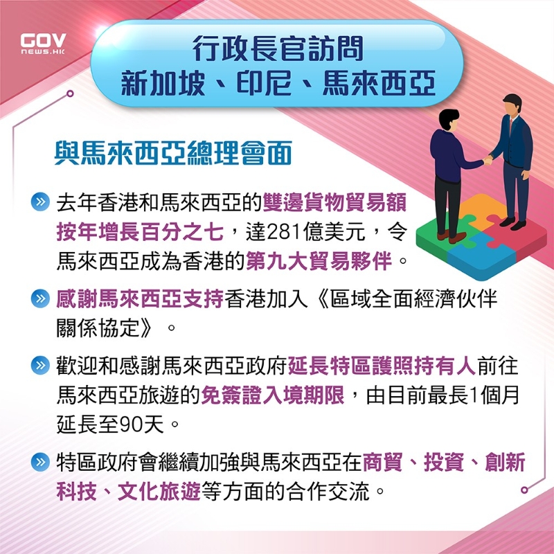 李家超(右)在馬來西亞吉隆坡與馬來西亞總理安華(左)會面。 李家超向安華表示,歡迎和感謝馬來西亞政府延長特區護照持有人前往馬來西亞旅遊的免簽證入境期限,由目前最長一個月延長至90天。他指有關安排給予特區護照持有人更大的入境便利,將進一步加強兩地的聯繫,互利共贏。 隨後李家超出席由中華人民共和國駐馬來西亞特命全權大使歐陽玉靖所設的午宴。他感謝歐陽大使及大使館為這次訪問作悉心安排,以及一直支持特區政府爭取盡早加入《區域全面經濟伙伴關係協定》的工作。晚上,李家超一行與馬來西亞全國工商總會成員共晉晚餐。李家超在晚宴上指,香港與馬來西亞在貿易、投資等領域的合作有龐大的發展潛力,香港駐雅加達經濟貿易辦事處將繼續與商會和當地商界緊密合作,加強雙邊關係。