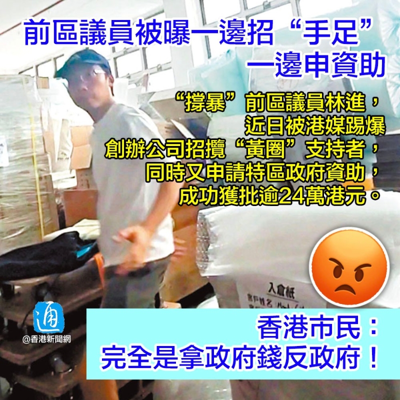 香港新聞網7月31日電 曾經高調撐“黑暴”的前區議員林進,近日被港媒踢爆創辦公司招攬“黃圈”支持者,同時又申請特區政府資助,成功獲批逾24萬港元,被質疑是“拿政府錢反政府”。 據港媒報道,林進辭任區議員後嘗試創業,與疑似有黑社會背景的人士創辦“同行搬屋”,表面是一家搬家公司,實際具有強烈的“黑暴”及反政府意識。