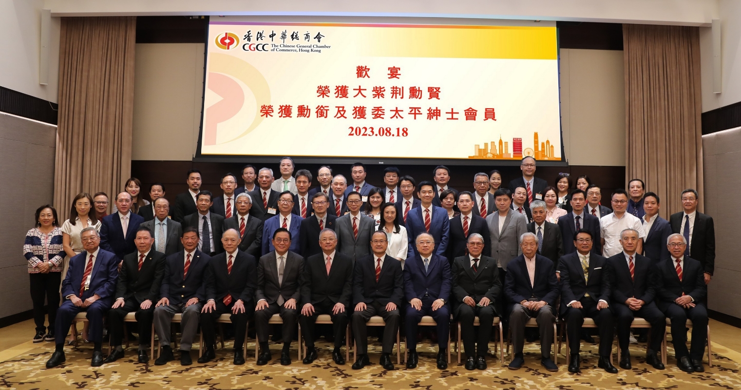 香港新聞網8月21日電 香港中華總商會日前假該會會所舉行晚宴,祝賀2022及2023年大紫荊勳賢,以及該會榮獲金、銀、銅紫荊星章、行政長官社區服務獎狀及獲委任太平紳士的首長、會董及會員。