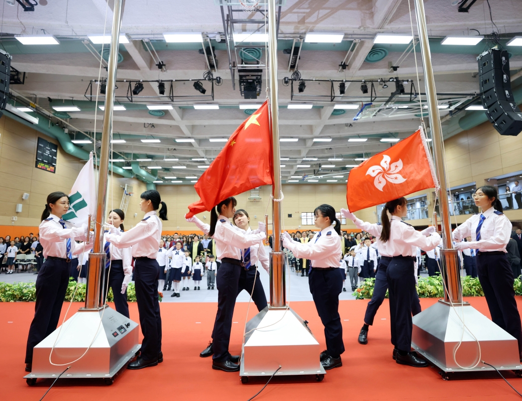 香港新聞網9月4日電 香港教育大學(教大)4日早上在大埔校園舉行開學日升旗禮,為新學年揭開序幕。 這次升旗儀式由教大校董會副主席陳浩華、司庫凌潔心、校長李子建、一眾副校長、院長及其他大學管理層主禮,近1000名教大、教大賽馬會小學及教大幼兒發展中心的師生出席。