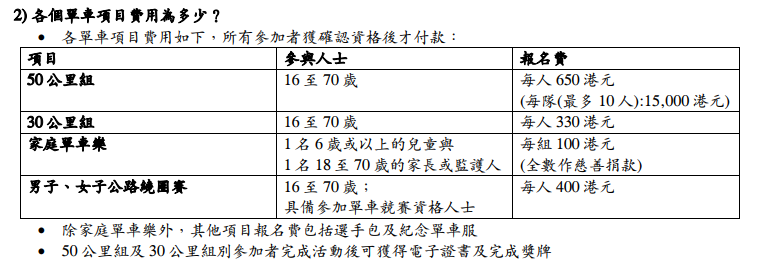 香港新聞網9月5日電 “香港單車節”將於10月舉行,參賽者可在6日上午10時起,可到網站報名參加“50公里組”、“30公里組”及家庭單車樂3個非競賽項目。本屆競賽項目之一,“男子、女子公路繞圈賽”,6日亦開放報名。
