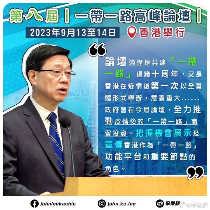 香港新聞網9月12日電 行政長官李家超今日(12日)出席行政會議前見記者,宣布香港將由明日起一連兩日舉辦第八屆“一帶一路高峰論壇”,是適逢共建“一帶一路”倡議十周年,亦是疫情後第一次以全實體形式舉辦,意義重大。