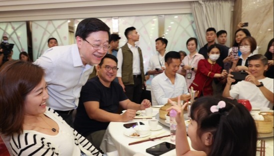 當天下午兩點多,李家超一身休閒裝,一個標誌性燦爛笑容,出現在荃灣一個公屋區。此行重點的長者中心,李家超探訪了兩個長者照護中心,其中有九旬老人。 公屋區的商戶見到特首落區都十分雀躍,紛紛與特首揮手打招呼,還有老闆作揖。特首也一一回應,揮手、抱拳,駐足向店內老闆詢問“生意好嘛?” 經過藥材店、文具店後,李家超走進一家雜貨店與老闆夫婦交流約一分鐘。店主分享近年生意受挑戰,李家超認真聆聽,頻頻點頭,並對店主說,深知各行各業的壓力,鼓勵大家共同面對。 “有他這樣的特首,是香港的榮幸!”這位與特首交流的商戶隨後接受媒體採訪時,以一句話總結了交流內容。 探訪結束已是下午三時多,恰逢學校放學。李家超在福來村偶遇放學的學童,應邀和他們親切合照。其中一名小朋友,更被特首問到如何拼“English”,但卻拼錯了。李家超隨即勉勵他要更努力學習英語,場面歡樂。 雖然李家超在福來村錦全幼稚園的停留時間不長,但麥校長和小朋友都對李家超的到訪感到欣喜,形容他“非常友善,非常親切”。 李家超落區探訪也吸引了不少市民和街坊前來觀看和合影。特首幾乎有求必應,熱情與街坊一一合影。(完) 【編輯:張明臻】