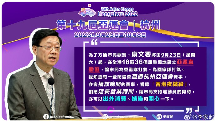 (圖源:李家超微博) 李家超在社交平台發文指,就虛擬資產的發展,特區政府的政策是要有一個有效的監管制度保障投資者,資訊發放要公開透明,以及重視和推行投資者教育,確保公眾充分掌握虛擬資產的風險及運作情況。強調證監會將繼續監察市場變化發展,政府亦會大力推動投資者教育。 此外,李家超稱,已向傳媒預告將於本周五(9月22日)一連四天到訪杭州,出席第十九屆亞運會的開幕式,以及到選手村和賽事現場親身為運動員打氣。他指,在港市民也可透過康文署場地的“亞運直播區”或提供直播的商場觀賞賽事,一起支援中國香港的運動員和國家隊的運動員。