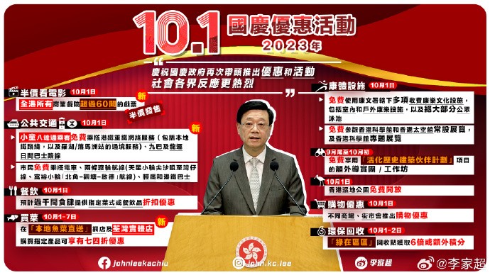 (圖源:李家超微博) 他感謝社會各界大力響應,推動不同種類的免費或優惠活動,並鼓勵市民踴躍參與,過一個開心又繽紛的國慶日。(完) 【編輯:刘春】