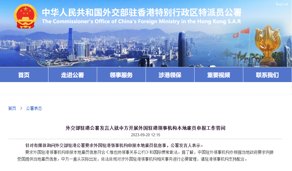 香港新聞網9月20日電 外交部駐港公署今日(20日)表示,要求外國駐港領事機構申報本地僱員信息符合《維也納領事關係公約》和國際慣常做法。