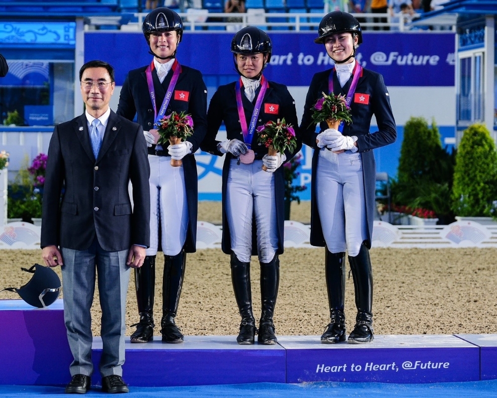 馬會馬術隊騎手在杭州亞運會馬術盛裝舞步團體賽奪得一面銅牌。 中國香港馬術隊當天與八支隊伍在桐廬馬術中心較量,最後以204.852分的成績,贏得一面銅牌。 隊中的馬會馬術隊成員蕭頴瑩和何苑欣,為獲得此殊榮感到高興;團隊中另一名馬會馬術隊成員陳萃彥更是首度出戰亞運。 在2018年雅加達亞運會盛裝舞步個人賽摘金的蕭頴瑩,夥拍馬會贊助馬匹“馬會驍騰”參賽。她說,很榮幸再一次代表中國香港贏取獎牌,感謝馬會及馬術總會的支持,才能成就這個殊榮。 何苑欣是2014年仁川亞運會馬術三項賽團體銅牌得主,這個獎項對她來說別具意義,她說:“能在不同馬術項目贏得亞運獎牌,我感到相當自豪;感謝馬術總會一直以來的支持,以及馬會的支援團隊與我們緊密合作。” 首次出戰亞運即取得獎牌的陳萃彥,歸功於專業團隊的支援。她說:“我們很感恩一直獲得馬會及馬術總會的支持,多年來給予騎手眾多參與賽事的機會,累積寶貴的實戰經驗。”
