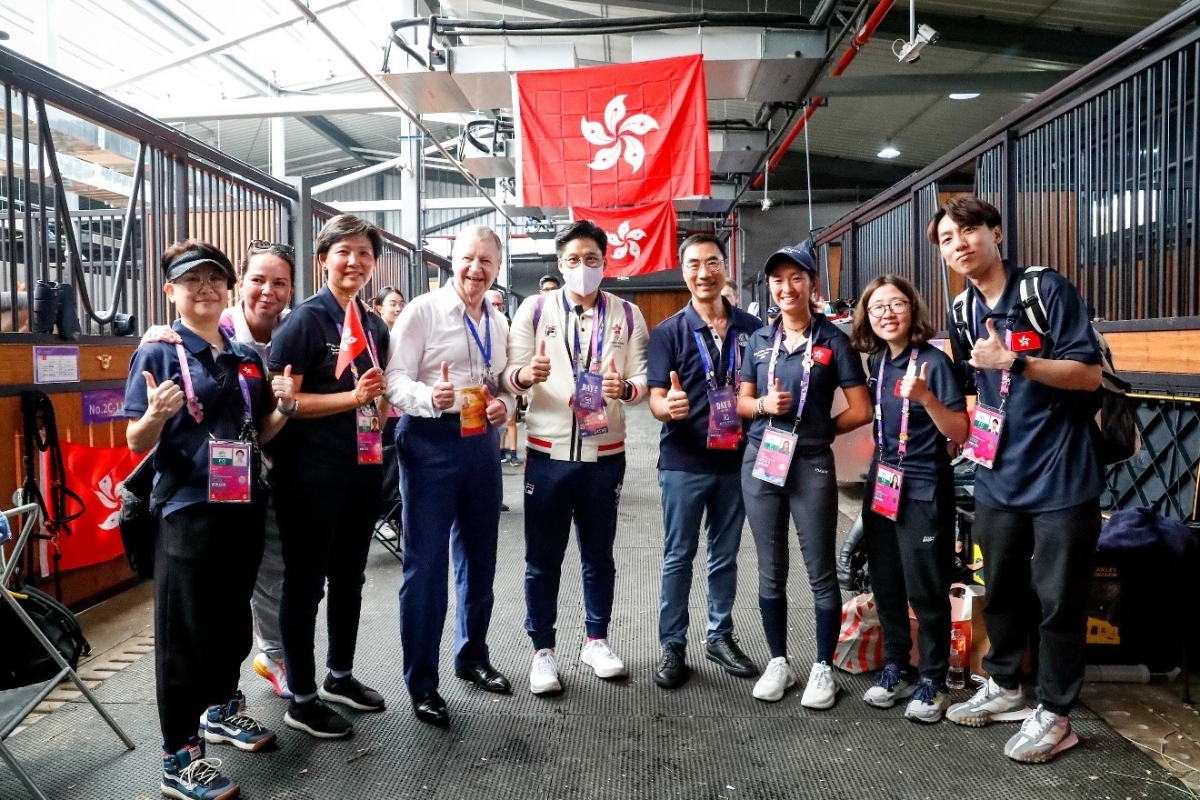 香港賽馬會主席兼中國香港馬術總會會長利子厚 (右4),馬會行政總裁應家柏 (左4)、中國香港體育協會暨奧林匹克委員會副主席兼杭州亞運中國香港代表團團長霍啟剛 (左5),與馬術總會一眾代表,於賽前到桐廬馬術中心為運動員打氣。 中國香港馬術隊共有九名成員 (11 對人馬組合) 出戰今屆亞運會,參加盛裝舞步、三項賽及場地障礙賽,是馬術隊首次於三個項目同時出戰個人及團體賽事。香港賽馬會馬術培訓經理鮑愛勤擔任中國香港馬術隊的領隊。馬會是次派出的支援團隊包括教練、獸醫、釘甲匠、物理治療師,以及在“香港馬術精英計劃”下的支援團隊,為騎手及馬匹在亞運賽事期間提供專業支援。 憑藉在馬術籌辦工作的獨特優勢及先進經驗,馬會並為今屆杭州亞運會馬術項目的六項業務領域提供技術支援,包括生物安全、馬匹運輸、馬房管理、獸醫和釘甲服務、場地運作以及國際持份者聯絡。 此外,馬會推出“賽馬會優秀運動員獎勵計劃”,以表揚於大型運動會中奪得佳績的運動員,進一步支持本港體育發展。於杭州亞運會摘下團體項目銅牌的中國香港馬術隊,亦將符合資格透過該計劃獲發500000港元現金奬勵。 (完) 【編輯:张明臻】