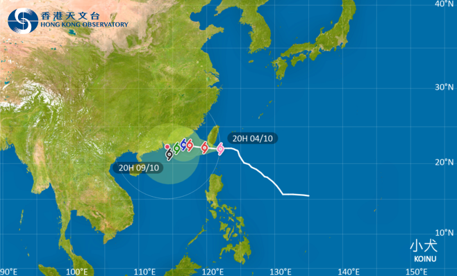 香港新聞網10月4日電 香港天文台在4日晚上9時40分發出一號戒備信號,表示有一熱帶氣旋,在香港約800公里內,可能影響香港。 依照現時預測路徑,熱帶氣旋“小犬”會在5日掠過台灣地區的南部,以及移向廣東東部沿岸海域,與香港保持超過500公里距離。