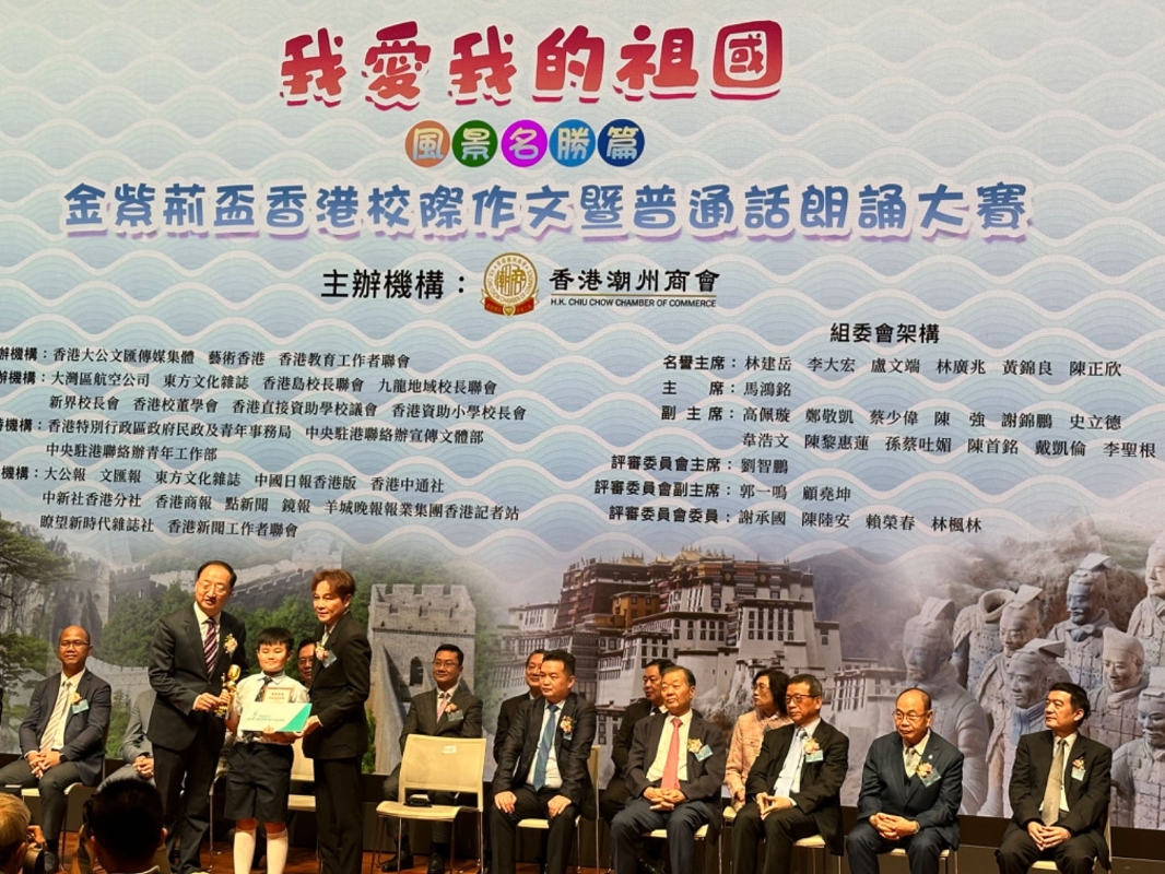 香港中通社圖片。陳卓儀攝 組委會主席、香港潮州商會會長馬鴻銘表示,舉辦本次活動,是香港潮州商會“弘揚文化、服務社會、興學育才”宗旨的體現。他希望透過比賽能增進學生對國家與民族的認同感與歸屬感,讓他們透過筆端和口說,表達出對祖國的感激之情以及對未來的美好展望。同時他透露,香港潮州商會也將會繼續不斷地舉辦多元的文化活動,展現香港獨特的文化特色和多元融合的創造性和魅力。 藝術香港出品人張錦洲表示,同學們以優美的普通話,以真摯的情感,向我們展示了祖國的美麗和壯麗。在參賽的過程中,不僅提升了自己的國語水平,更培養了對祖國的深厚感情。少年智則國智,少年富則國富;少年強則國強。他寄語同學們努力學習,茁壯成長,為祖國的富強昌盛,為香港的繁榮穩定做出貢獻。 組委會名譽主席、香港教育工作者聯會主席黃錦良表示,此次比賽自8月初正式啟動,得到了香港教育界的熱烈支持,近百間香港中、小學踴躍報名並提交作品。大賽以“我愛我的祖國”為主題,也正是希望通過作文和朗誦的形式,讓同學們更加深入地瞭解和感受祖國的悠久歷史、燦爛文化和偉大成就,從而增進他們的愛國意識。他相信,在參與本次大賽的過程中,同學們一定能夠增強對祖國的認同感和歸屬感,培養自己的愛國之情、砥礪強國之志,從而更加自信、自豪地面對未來。 大灣區航空公司行政總裁許漢忠表示,大灣區航空公司一直以來都非常重視青少年的愛國主義教育,並致力於履行企業社會責任,時刻不忘回饋社會。為支持本次活動無償提供香港至台北來回機票作為特等至三等獎學生獎勵。他希望本次活動能夠幫助同學拓展視野、增長見識,拓展視野和思維。 評審委員會副主席、香港新聞工作者聯會副主席郭一鳴介紹了本次大賽評審的相關情況,本次大賽參賽學校不僅有中學組,還增加了小學組。學生們從不同的角度來寫作,其中有寫第一次踏入家鄉感受的,也有時隔幾年再次回到內地發現發展變化的,也有抒發對祖國大好山河讚賞的。本次評審,先後邀請了三十多位專業評委,包括一些在文化與教育領域有較高聲譽的評委,共評出小學組及中學組各組別特等獎1名、一等獎4名、二等獎9名、三等獎13名。及大賽優秀獎二十二名,經複審以及特聘核數師對評分核算,符合程序。