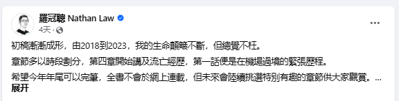 香港新聞網10月11日電 被香港保安局局長鄧炳強形容為“現代漢奸”的國安通緝犯羅冠聰,最近缺錢了? 羅冠聰日前在社交平台臉書發帖聲稱,正在撰寫以半自傳、半政治分析為主的新書。近日他再發帖,透露已逐漸形成初稿。回憶起過去數年,他惺惺作態地稱自己的“生命顛簸不斷,但總覺不枉”。