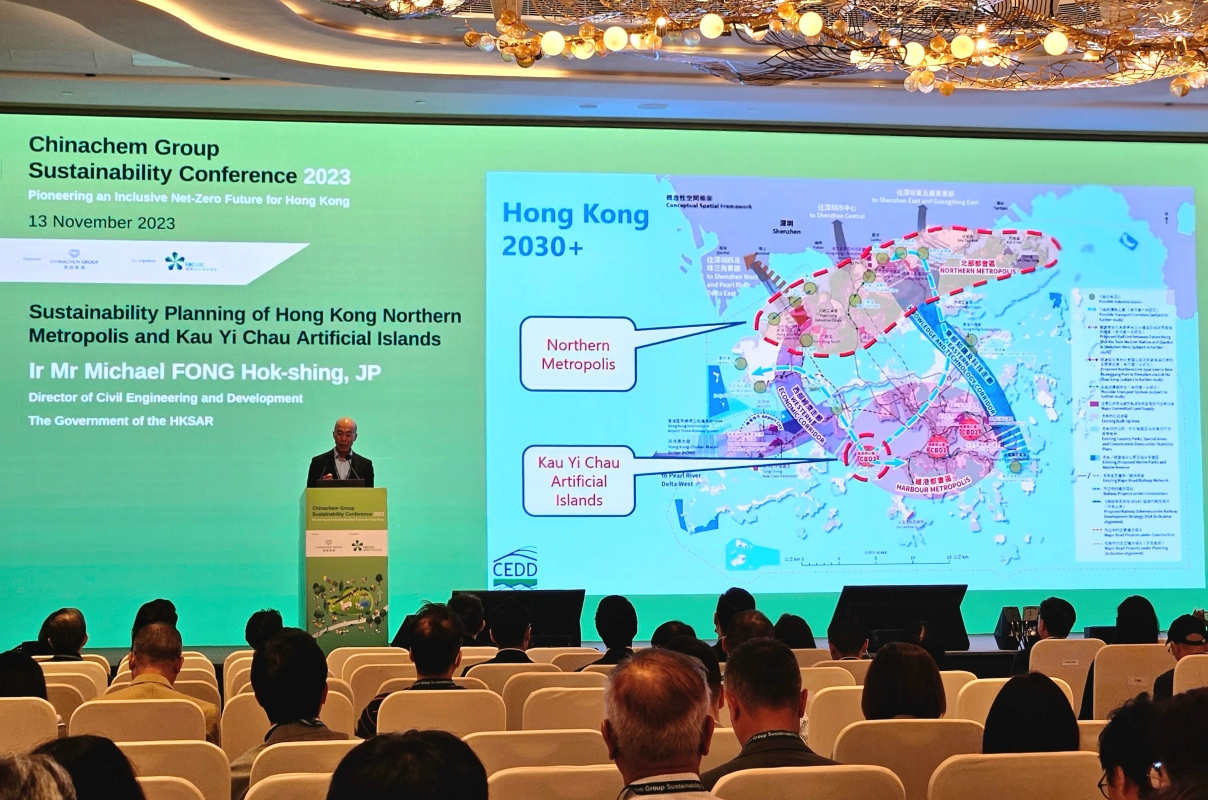 “可持續發展論壇2023”邀請16位來自不同界別的國際及本地講者主講。(圖片:主辦方提供) 香港特區政府土木工程拓展署署長方學誠今日上午出席論壇,並以“香港北部都會區及交椅洲人工島的可持續規劃”作分享。 方學誠向來自各界別的嘉賓分享道,交椅洲人工島和北部都會區項目是香港兩個策略增長區。與已建市區不同,人工島是全新規劃和建設,有較大空間做好城市設計,透過填海新建大片土地的機遇,將為香港提供更多元化的發展空間。人工島強調SGR(智慧、環保及具抗禦力城市)的城市策略,以構建碳中和社區為目標,務求打造新一代的核心區域。