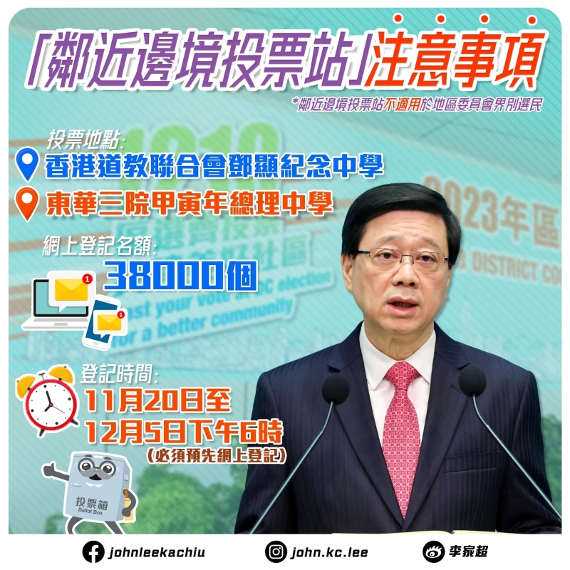 李家超FB圖片。 另外,香港特區政府為方便在內地生活的香港人回港投票後返內地,在上水港鐵站附近的兩所學校,設立鄰近邊境投票站,分別是香港道教聯合會鄧顯紀念中學,以及東華三院甲寅年總理中學。有關人士由20日起可在網上登記預約,名額共38000個。 新一屆區議會共有470個席位,其中264名區議員由選舉渠道產生,179名議員由行政長官委任,27名當然議員由各鄉事委員會主席擔任。(完) 【編輯:孟宜君】