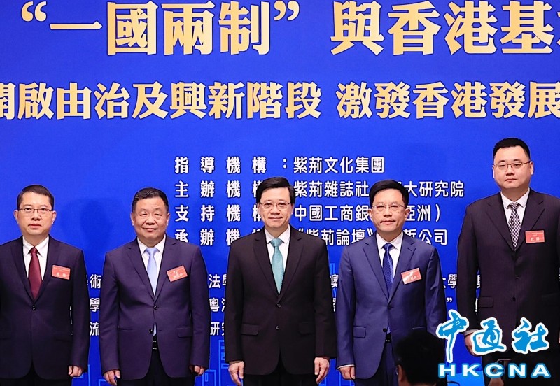 香港特區行政長官李家超(中)等嘉賓出席研討會開幕式。香港中通社圖片 特區行政長官李家超就如何把握“一國兩制”與基本法獨特優勢提出“四要”,包括要堅守“一國”,弘揚愛國主義;要發揮“兩制”,聯通內地和全球發展機遇;要主動出擊,推廣“一國兩制”成就;要居安思危,完善維護國家安全制度。 中聯辦秘書長王松苗指出,法治是香港保持長期繁榮穩定的重要基石,是香港走好“由治及興”新征程、激發自身發展新動能的堅實保證。需貫徹“一國兩制”方針、堅定維護憲法和基本法確定的香港特區憲制秩序、堅持中央全面管治權和保障特區高度自治權相統一、並發揮獨特優勢,保持和發展香港普通法制度。 紫荊文化集團董事長許正中致辭稱,投資香港,就是投資明天;擁抱香港,就是擁抱未來。紫荊文化集團堅定看好香港的投資機遇和發展前景,將持續加大投資,拓展產業布局,採用領先科技,豐富文化業態,積極搭建智庫交流平台、文化藝術交流平台,助力香港中外文化藝術交流中心建設。 主旨演講環節,中國全國人大常委會港澳基本法委員會、全國港澳研究會以及高校、研究機構的13位專家學者分別發表演講。 全國人大常委會香港基本法委員會原副主任、香港特區政府首任律政司司長梁愛詩表示,粵港澳大灣區的經濟發展和對外開放,香港可以發揮支撐引領作用。香港與內地在商貿或服務行業共同開擘一條條新跑道;香港服務貿易市場成熟開放、人才匯集,可以成為國際貿易爭議解決的中心之一。 全國港澳研究會副會長譚耀宗認為,香港需堅定不移堅持統籌發展和安全這兩件大事,讓廣大香港市民都能分享國家發展以及香港發展的紅利。 本次研討會由紫荊雜誌社和天大研究院主辦,中國工商銀行(亞洲)以及香港中國學術研究院、清華大學港澳研究中心、北京大學港澳研究院等支持。(完) 【編輯:馬華】