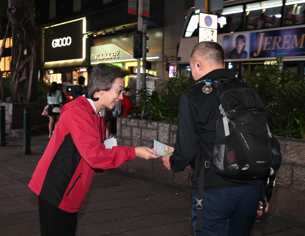 香港新聞網11月27日電 香港特區政府公務員事務局義工隊27日晚上到尖沙咀區,向商鋪店員和市民大眾宣傳區選齊投票,並派發宣傳單張,呼籲市民在12月10日投票選出為社區服務的區議員。