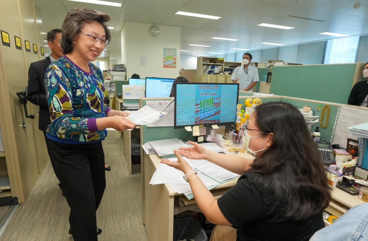 楊何蓓茵一行人到訪不同樓層“洗樓”,向局內的政務主任、行政主任、文書及秘書職系同事派發1210單張。她說,一行人與同事傾談時得知,部分同事於區選投票日有雙重身份,一是登記選民,二是負責選舉的工作人員,獲派至不同的工作崗位。當中,除了在普通票站工作外,有居住於市區的同事,於1210區選投票日凌晨於離島展開工作,負責運送選票至票站,也有同事獲分派至懲教院所裡的票站工作,還有同事獲派往這次選舉的中央指揮中心工作。 “政府多次強調,容許投票日上班的同事離開工作崗位投票,有關同事有需要可以申報的士車費。有同事向我們透露,自己在1210區選投票日於清晨時分開始工作,已獲告知當日下午時份,可以返回所屬選區的票站投票,之後再返回票站繼續執行選舉工作職務。” 楊何蓓茵衷心感謝3萬多名來自不同決策局/部門的公務員同事,負責不同環節的選舉實務工作,確保今次區選在公平、公正、誠實及安全有序進行。我深信,肩負選舉工作的公務員同事,必定會竭盡所能,勇於擔當,同心協力把這場區選做好。 最後,她再次呼籲全港選民,包括所有公務員同事以身作則,履行公民責任,“一人一票一剔”,選出有能力、做實事的區議員,共建美好社區。 (完) 【編輯:陈卓仪】