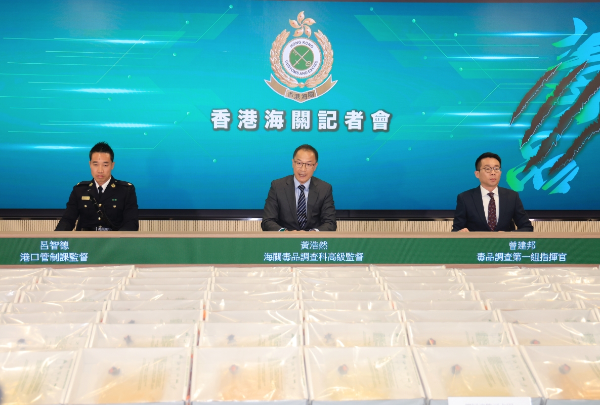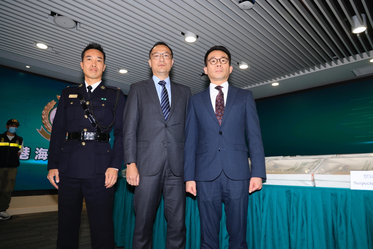 海關毒品調查科高級監督黃浩然(中)、海關港口及海域科港口管制課監督呂智德(左)及海關毒品調查科毒品調查第一組指揮官曾建邦(右)出席。