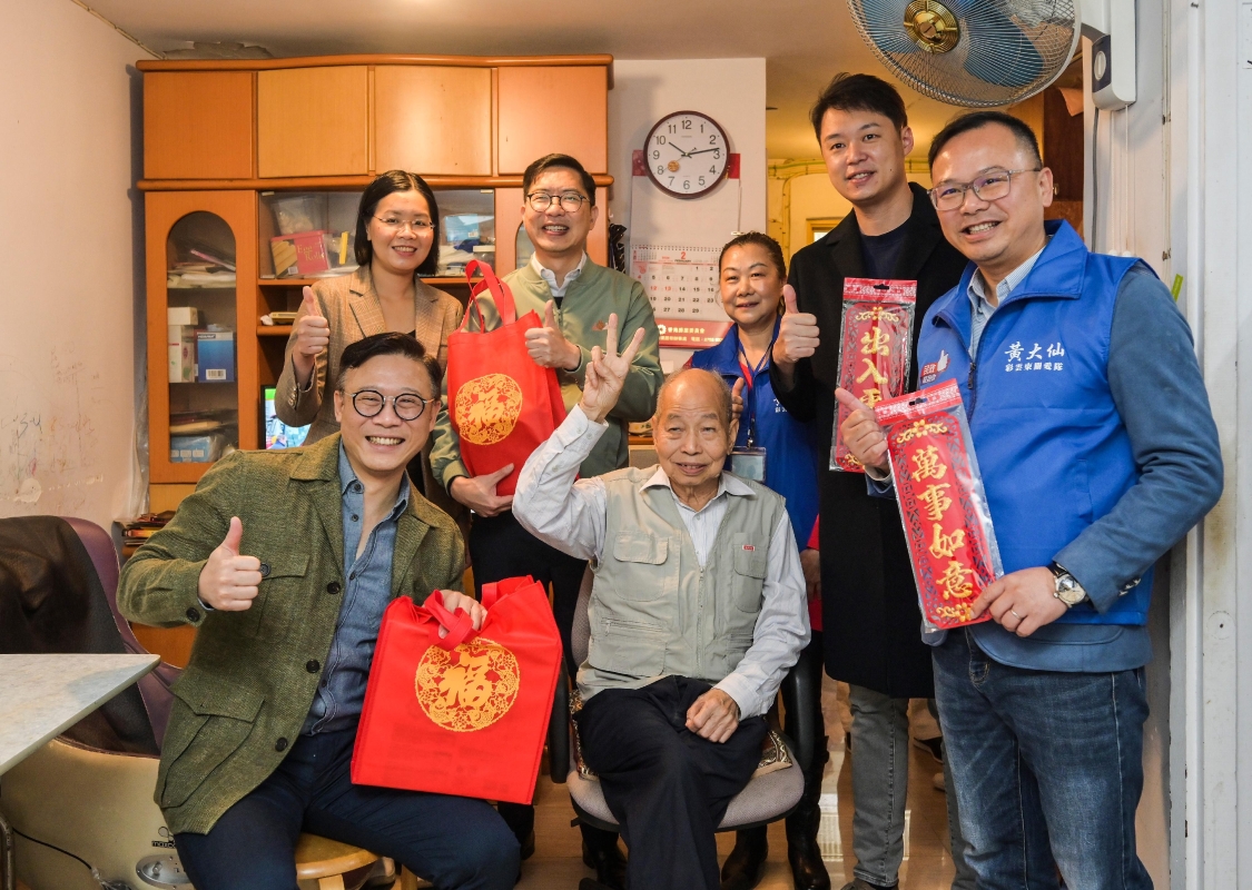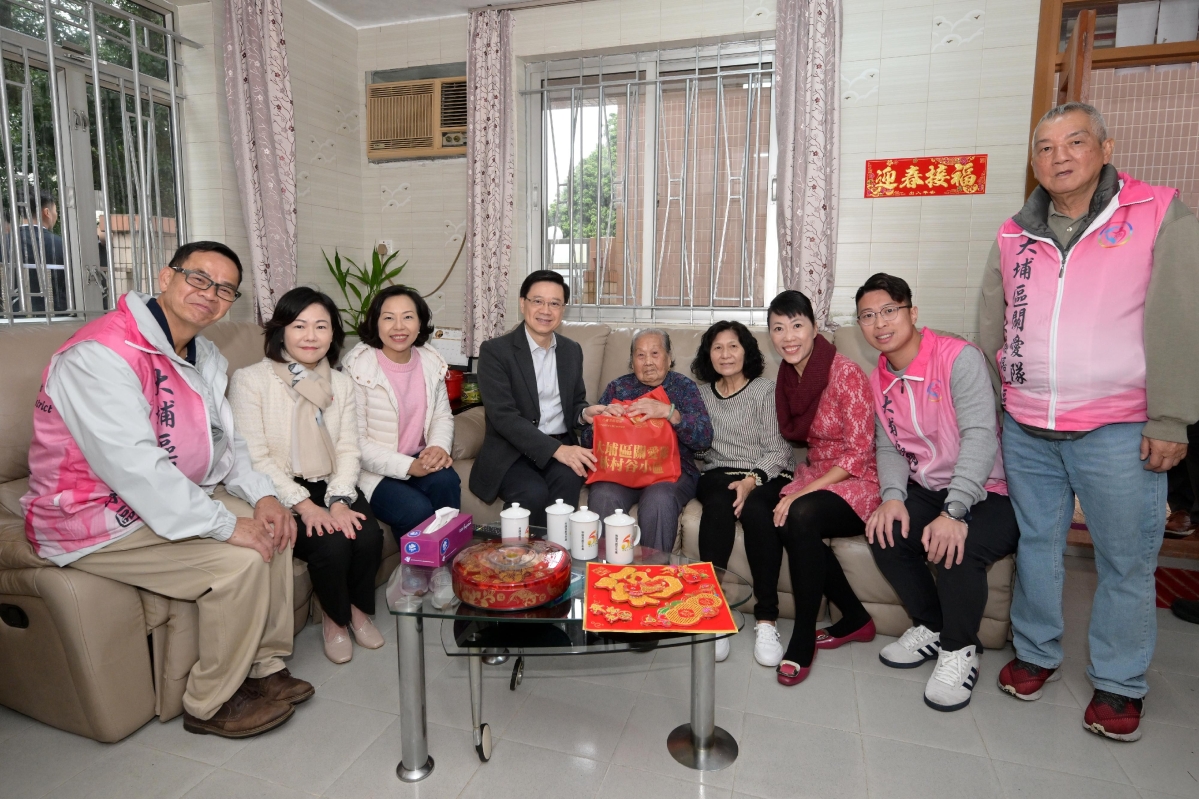 行政長官李家超、民政及青年事務局局長麥美娟和民政事務總署署長張趙凱渝7日早在大埔民政事務專員陳巧敏陪同下,聯同大埔區地區服務及關愛隊伍(關愛隊)代表探訪居於鍾屋村的91歲侯婆婆,了解她的生活情況,並送贈賀年福袋,表達特區政府的心意,與市民共享節日歡欣。