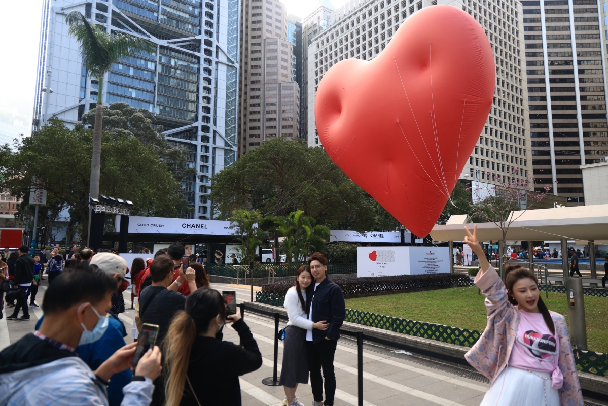 香港中通社圖片。 藍天白雲下,一顆正紅色的心型氦氣球隨風搖曳,憨憨的可愛形象,為情人節增添濃情蜜意。 這是由英國時裝設計師Anya Hindmarch設計的飄浮紅心裝置Chubby Hearts,繼於倫敦登場後,首次來到香港。12米巨型飄浮紅心當天在中環皇后像廣場花園亮相,特首李家超與夫人林麗嬋出席揭幕禮,兩人也舉起手機自拍留念。 2月14至24日情人節至元宵節期間,紅心裝置將在維港兩邊、旺角花墟和太平山頂等16個景點快閃,供市民遊客打卡。 雖說愛情“講心不講金”,有了紅心裝置的情人節,怎能少得了花費。