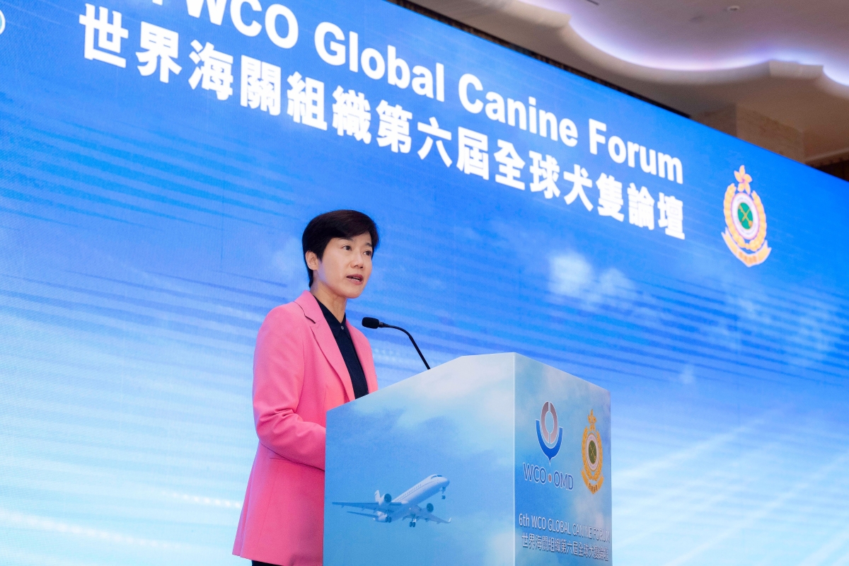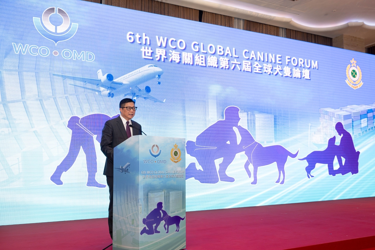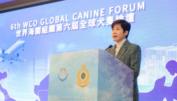 香港新聞網3月5日電 香港海關3月5日舉辦一連三天的世界海關組織第六屆全球犬隻論壇,保安局局長鄧炳強、香港海關關長何珮珊及世界海關組織守法與便利司司長Pranab Kumar Das主持開幕典禮。 全球犬隻論壇是世界海關組織的一個重要活動,自2011年以來每兩年舉辦一次,讓全球海關分享和交流領犬工作的經驗。 鄧炳強在開幕典禮上歡迎來自40多個海關組職的90多名代表來港參與這個首次在亞洲舉辦的論壇。他表示搜查犬不單是海關執法職責中不可或缺的夥伴,也肩負向青少年宣揚禁毒訊息的重任。