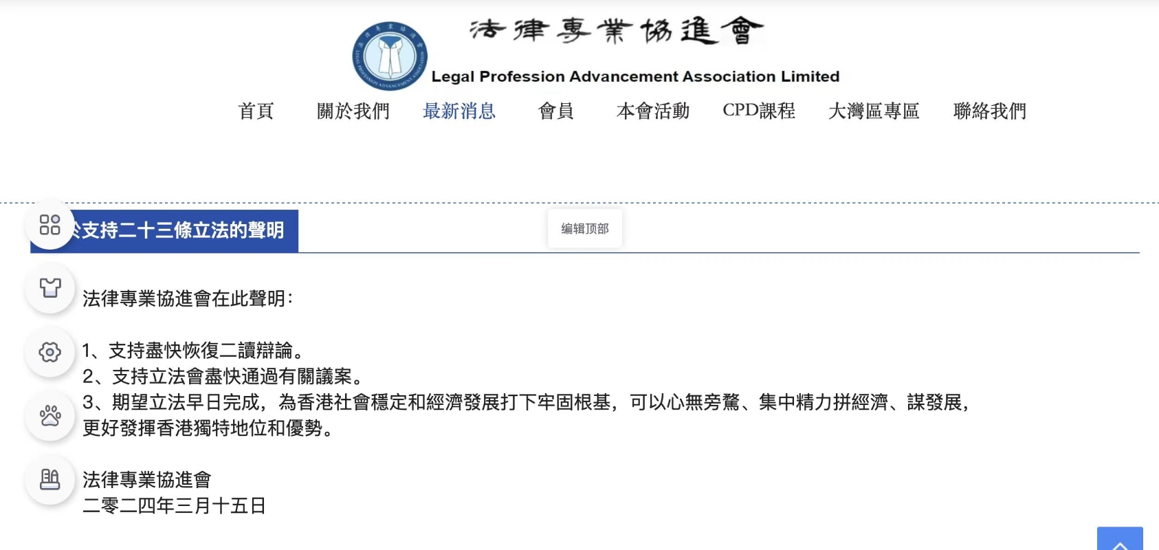 香港法律專業協進會發表聲明支持基本法第23條立法