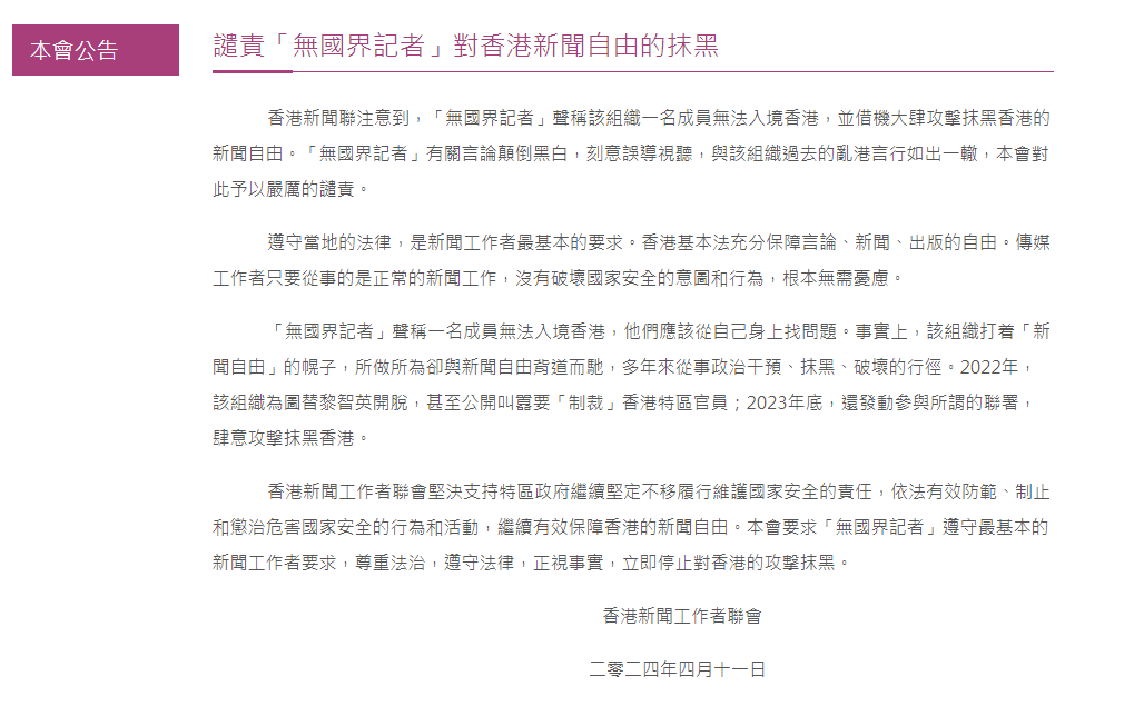 香港新聞聯譴責“無國界記者”抹黑香港新聞自由分享到: