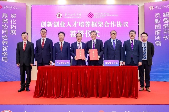 香港理工大學供圖 雙方在廣工大學城校區國家級創新創業教育實踐基地–工大創谷舉行簽署儀式。在理大校董會主席林大輝博士、副校長(研究及創新)趙汝恒教授、知識轉移及創業處總監王家達先生,與廣工黨委書記胡欽太教授、黨委常委、副校長王振友教授、黨委常委、副校級幹部張學理先生的見證下,由理大校長滕錦光教授和廣工校長邱學青教授代表雙方簽署合作協議。 林大輝博士表示:“我們相信雙方合作能充分發揮兩校優勢,為推動粵港澳大灣區建成世界一流灣區貢獻力量。理大已建立起一個完整的創業培養生態系統,創新及創業亦成為本科生課程的必修課。今次合作項目啟動後,兩校將開展全方位合作,包括建立兩地創新創業人才服務諮詢樞紐、合辦國際交流活動、推動兩校學生的創業合作專案落地等,在多領域攜手培養高素質創新創業人才。 ” 胡欽太教授表示:“跨境合作培養人才,是兩校錨定粵港澳大灣區一點兩地戰略定位、服務融入大灣區建設、推動學校高質量發展的重要舉措。廣工將與理大共同打造協同推進中國式現代化灣區融合發展的新標杆,攜手為新質生產力發展培養拔尖創新人才,助力粵港澳大灣區建成世界高水準人才高地,促進兩地學生交流,為粵港青年融入時代發展提供機遇。” 理大與廣工將展開全方位合作,利用兩校創新創業教學資源、專業人才和社會網絡,實現資源共享,以“背靠祖國、聯通世界”的優勢,推動有利創新創業人才培訓的協同發展,促進兩地學生構思開展創業項目,並在粵港澳落地孵化。 (完) 【編輯:陳偉根】