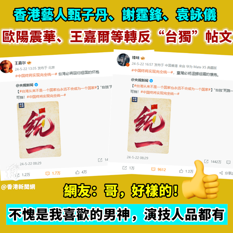 香港新聞網5月24日電 反“台獨”,這些香港藝人也發文了! 在台灣當局領導人賴清德“5·20”講話發表“台獨”言論後,5月22日一早,央視新聞官方微博發布帖文,強調“台灣從來不是一個國家,也永遠不會成為一個國家”,指出 “‘台獨’死路一條,祖國統一勢不可擋!中國終將實現完全統一。”有關帖文其後獲大批藝人轉發,當中亦不乏香港藝人。 翻看有關微博可見,內地藝人肖戰、檀健次、王鶴棣、王一博、王俊凱、易烊千璽、迪麗熱巴、楊紫、白鹿等紛紛加入轉發行列;持有微博賬號的香港藝人也不落人後,甄子丹、謝霆鋒、陳偉霆、袁詠儀、歐陽震華、惠英紅、王嘉爾、王祖藍等歌手、演員亦轉發央視有關帖文,表態反“台獨”。