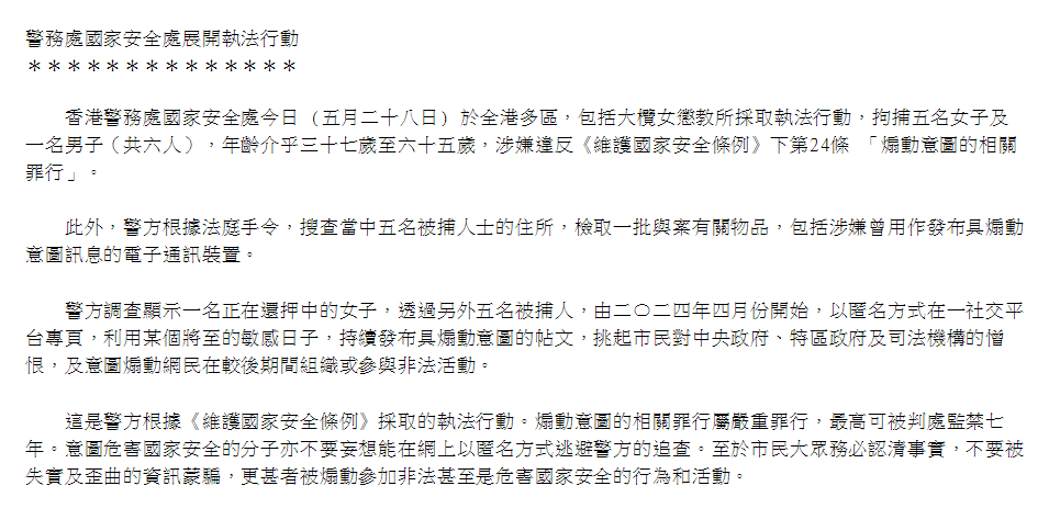 香港新聞網5月28日電 香港警務處國家安全處28日於全港多區,包括大欖女懲教所採取執法行動,拘捕五名女子及一名男子(共六人),年齡介乎37歲至65歲,涉嫌違反《維護國家安全條例》下第24條 “煽動意圖的相關罪行”。