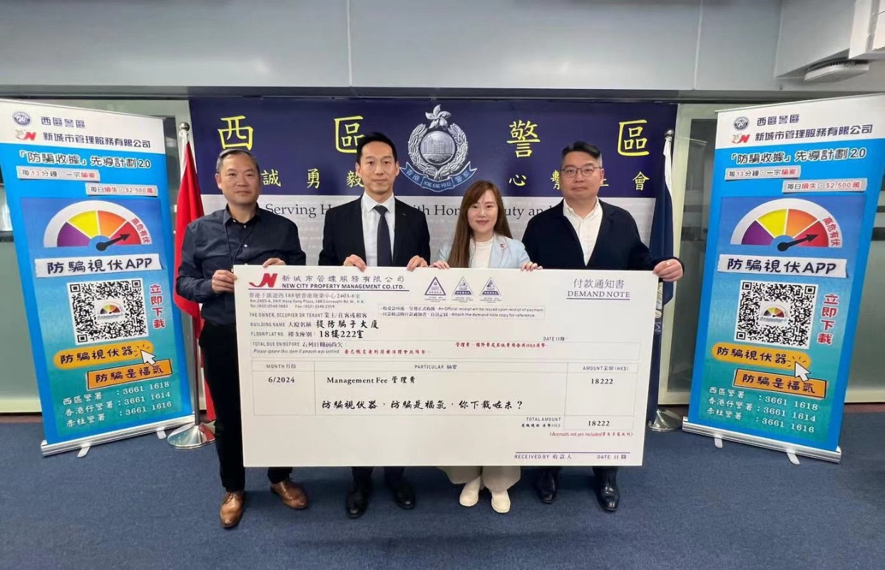 香港警方圖片。 根據2023年統計,香港平均每13分鐘,就會有1宗騙案,而每日損失總額超過 $2,500萬。因此,西區警區與新城市管理服務有限公司再度攜手合作,在其管理費收據印制新一輯口號“防騙視伏器,防騙是福氣,你下載咗未?”。並向多名管理人員提供防騙講座,海報及易拉架放在屋苑內,並由管理公司人員教導住客提防騙案及安裝防騙視伏APP。防騙收據先導計劃2.0為期由2024年6月至2024年12月。