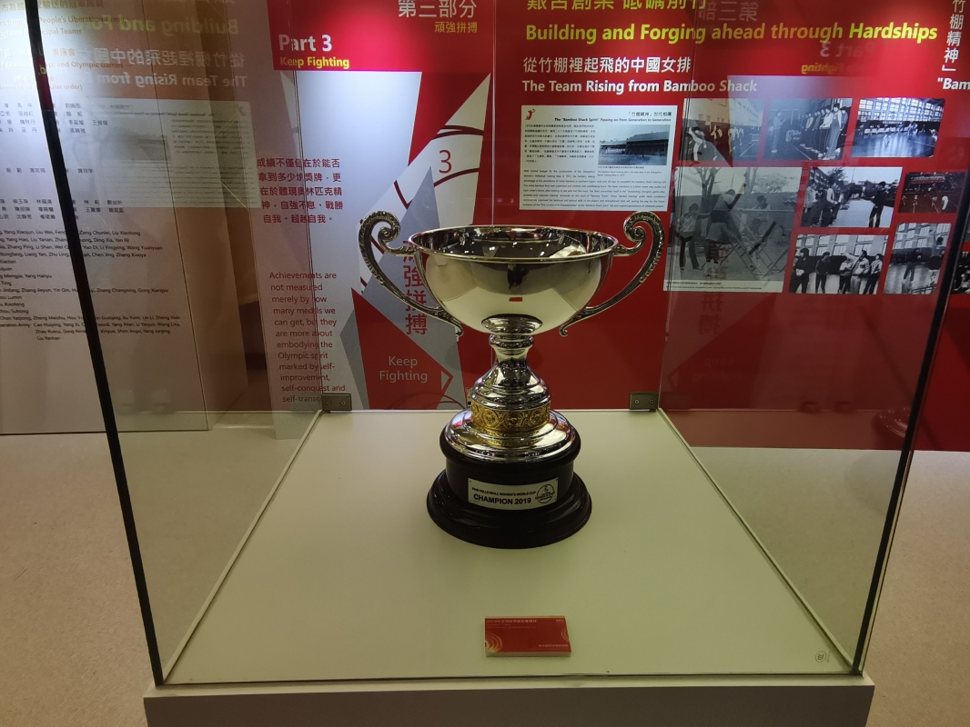 香港中通社圖片 展覽記錄了中國女排四十年來所取得的輝煌成就及拼搏精神,多角度展示中國女排勇奪十次世界冠軍的光輝之路,更配以生動的圖文解說及奪冠合集視頻。現場展品包括1981年、2003年及2019年女排世界盃冠軍獎盃;1984年洛杉磯、2004年雅典及2016年里約奧運會金牌等。