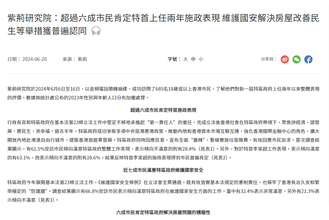 紫荊研究院調查:逾六成香港市民肯定特首上任兩年施政表現香港新聞網6月20日電 紫荊研究院於2024年6月6日至16日,以音頻電話隨機抽樣,成功訪問了685名18歲或以上香港市民,了解他們對新一屆特區政府上任兩年以來整體表現的評價,數據按統計處公布的2023年性別與年齡人口分布加權處理。