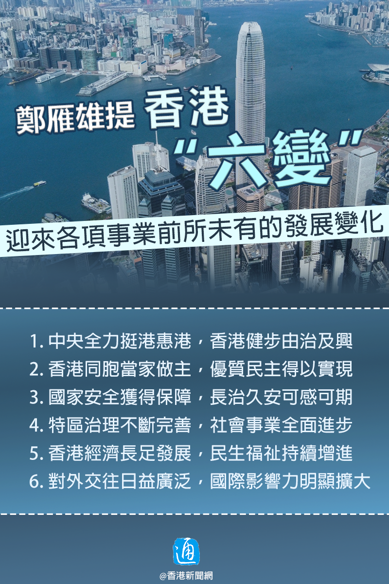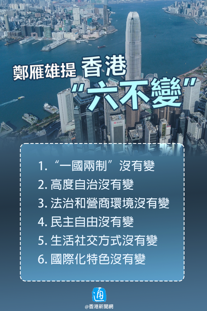 香港新聞網6月28日電 6月28日,中央政府駐港聯絡辦主任鄭雁雄應邀出席立法會午餐會並致辭。他指出,要準確把握“六不變”“六變”。不變的是,中央矢志堅守、港人全力擁護“一國兩制”,香港繁榮穩定堅如磐石,東方之珠浪漫依然;變的是,香港浴火重生,迎來各項事業前所未有的發展變化。