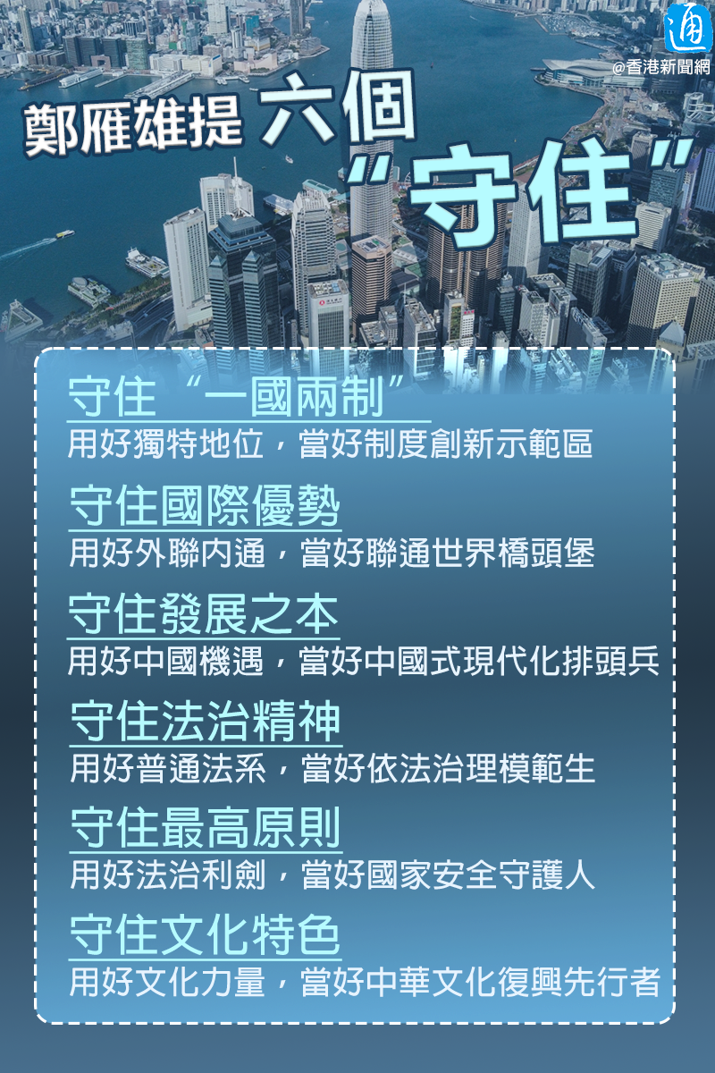 鄭雁雄稱,要守住不變根基,駕馭發展變局,用好獨特優勢,迎接香港新一輪大發展。
