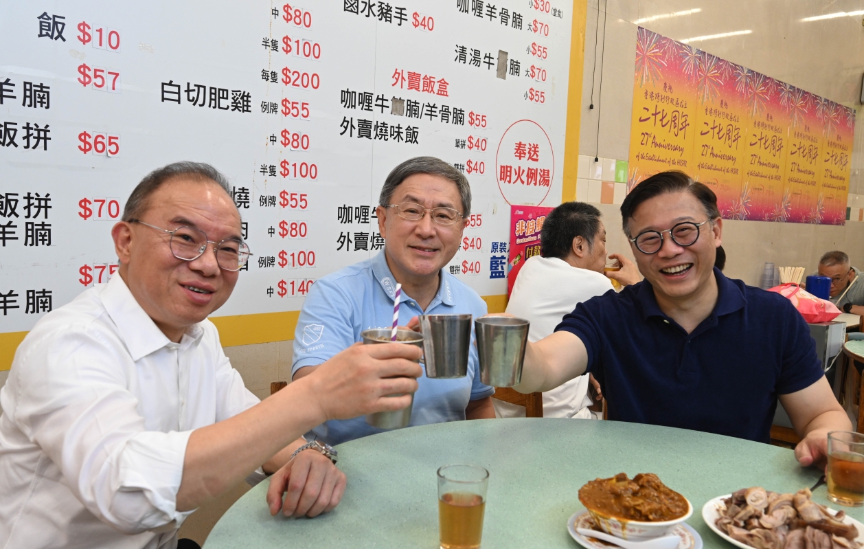 卓永興(中)、張國鈞(右)和曾國衞(左)。圖源:政府新聞處。 熟食中心午市座無虛設,氣氛熱鬧。三人點選了多種燒臘、滷水豬手豬肚、咖哩羊腩、蝦子柚皮等,以七一折的優惠價,大快朵頤。檔戶負責人在交談時說,很多市民均十分歡迎政府在7.1回歸的喜慶日子,帶頭提供各種優惠,以及推動各界提供飲食、購物、交通等優惠予市民,為回歸增添歡樂。 價格親民的香港街市熟食中心,不但是不少市民喜愛的平民食堂,其傳統美食手藝及獨有的風味,亦吸引不少遊客慕名到訪。香港素有美食天堂美譽,地道美食肯定是“香港無處不旅遊”的一大特色和賣點。 回歸27周年有林林總總的優惠供市民享用。三位司局長呼籲市民勿失良機,利用各種優惠為自己和家人炮製一個特別和歡樂的7.1假期。(完) 【編輯:譚暢】