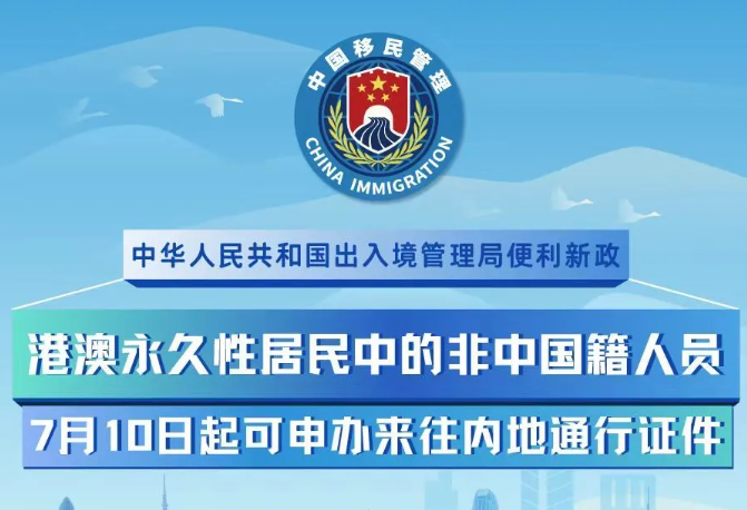 香港新聞網7月1日電 中華人民共和國出入境管理局7月1日發布公告,自今年7月10日起,為港澳永久性居民中的非中國籍人員簽發來往內地通行證件。