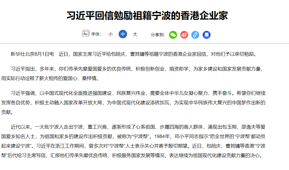 香港新聞網8月1日電 近日,國家主席習近平給包陪慶、曹其鏞等祖籍寧波的香港企業家回信,對他們予以親切勉勵。