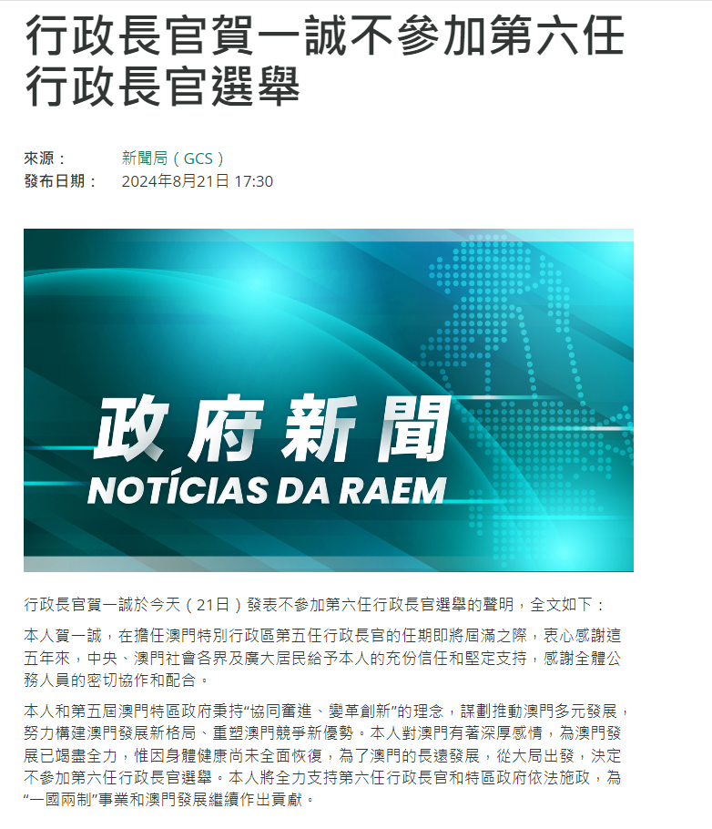 圖源:澳門特區政府網站。 他表示,自己和第五屆澳門特區政府秉持“協同奮進、變革創新”的理念,謀劃推動澳門多元發展,努力構建澳門發展新格局、重塑澳門競爭新優勢。 “本人對澳門有著深厚感情,為澳門發展已竭盡全力,惟因身體健康尚未全面恢復,為了澳門的長遠發展,從大局出發,決定不參加第六任行政長官選舉。”賀一誠指,自己將全力支持第六任行政長官和特區政府依法施政,為“一國兩制”事業和澳門發展繼續作出貢獻。 (完) 【編輯:譚暢】