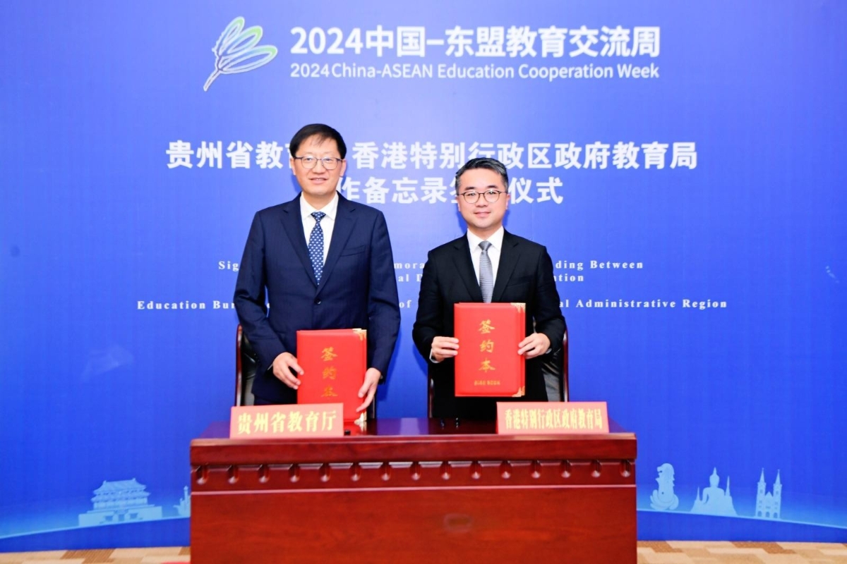 香港新聞網8月22日電 香港特別行政區政府教育局與貴州省教育廳22日在貴州舉行教育合作備忘錄簽約儀式,進一步加強香港與貴州的教育交流和合作。備忘錄由教育局副局長施俊輝和貴州省教育廳廳長鄒聯克簽署。