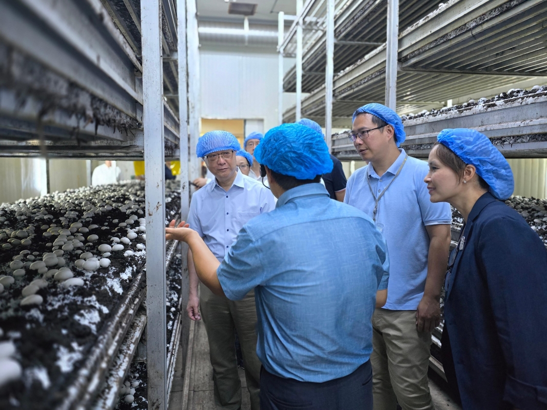 圖源:政府新聞處。 訪問團隨後參觀一間專注栽種菇類的生物科技公司,了解智慧化種植食用菌的最新發展,以及如何透過科學種植提升食物安全。謝展寰指香港逾九成的食物來自進口,其中內地是最重要的食物供應來源。他歡迎江蘇省的優質食物進口香港,豐富市民的食物選擇,並加強兩地的貿易聯繫。 下午,訪問團前往南京參觀一間農業生態發展公司,聽取人員講解青蝦養殖、蔬菜種植、農產品加工和冷鏈儲藏運輸等工作,並深入交流經營休閒漁農業的經驗。
