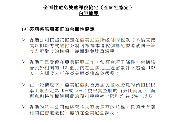 圖源:政府新聞處 政府發言人23日表示,全面性協定可確保香港及相關稅務管轄區的居民無須為同一收入兩度課稅,並使他們在從事跨境經貿及投資活動時,更清楚確定其稅務負擔和節省稅款。協定有助鼓勵香港及有關稅務管轄區的企業在對方境內營商或投資。 命令將於30日提交立法會進行先訂立後審議程序。全面性協定將會在香港及相關稅務管轄區各自完成有關批准程序後生效。 香港於2023年8月,以及今年1月、3月、6月及9月分別與孟加拉國、克羅地亞、巴林、亞美尼亞及土耳其簽訂全面性協定,令與香港簽署全面性協定的稅務管轄區增至51個。五份新全面性協定的內容摘要載於附件。(完) 【編輯:譚暢】