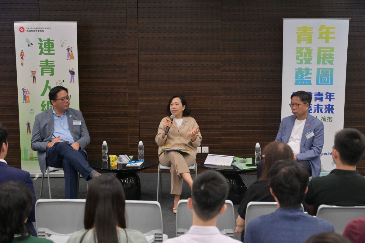 圖源:政府新聞處 麥美娟於座談會上介紹施政報告與青年發展相關的重點工作,並預告第二屆“青年發展高峰論壇”將於2025年下半年舉辦,鼓勵青年積極參與,把握機會與來自內地和海外的青年朋友互相交流學習。她表示“連青人網絡”現時已有超過10000名青年加入,民青局將繼續透過“連青人網絡”定期舉辦的“連青.有約”青年交流會及一系列的青年發展活動凝聚青年,持續、定期與更多青年溝通交流。