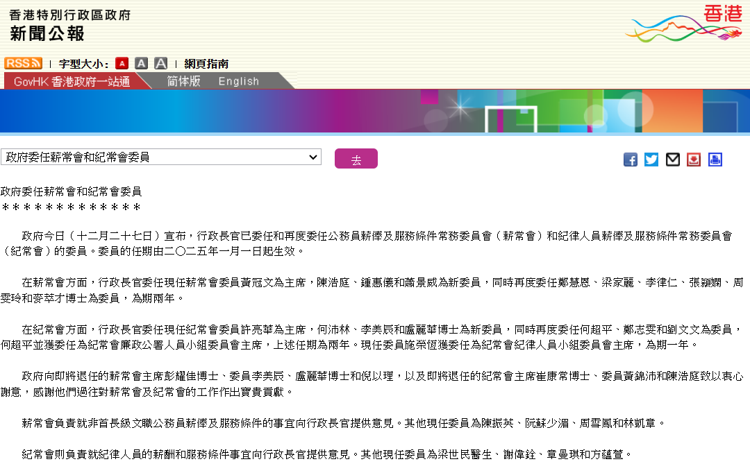 香港特區政府委任薪常會和紀常會委員分享到: