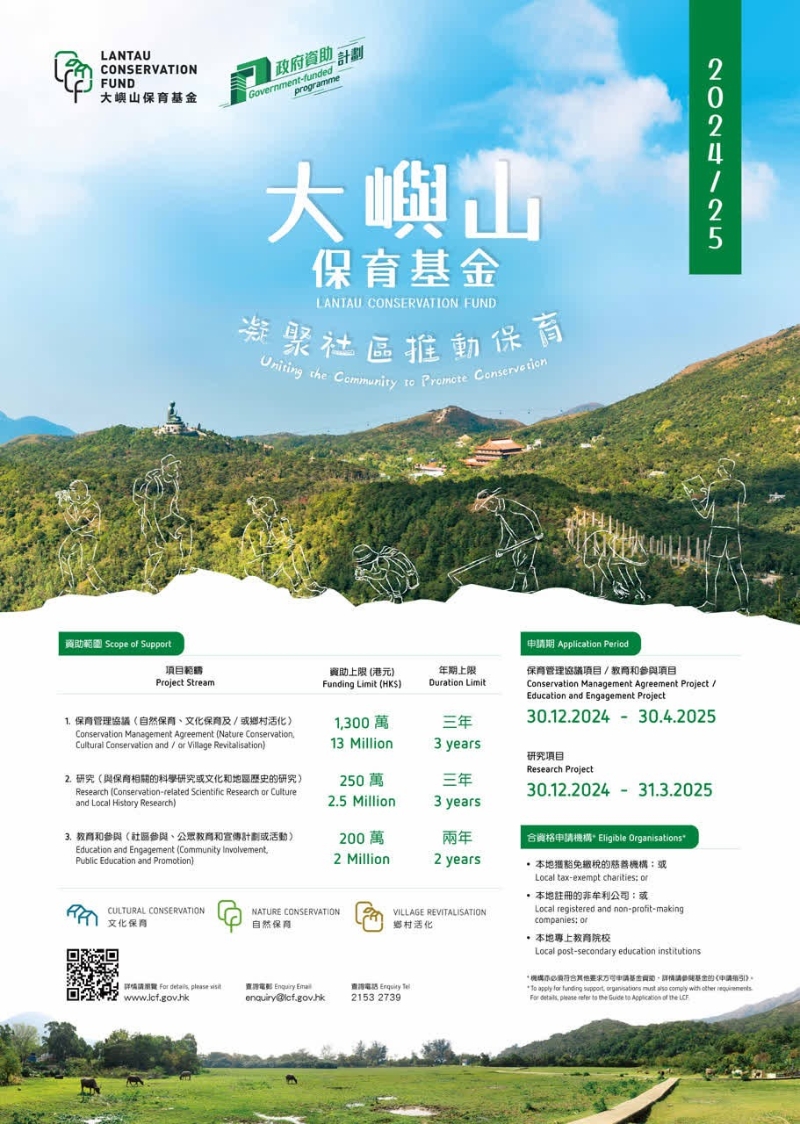 大嶼山保育基金網頁圖片 獲批出的3個項目包括,觀鳥會的水口自然保育管理計劃、浸會大學研究大嶼山軍事歷史的項目,以及戶外生態教育協會舉辦的蜻蜓生態教育保育計劃,合共批出約850萬港元。 該項目基金總額10億港元,用作資助合資格機構和專上院校進行研究及教育和參與項目,或與地區人士及土地擁有人合作推展大嶼山的保育及相關項目;以及用作支援保育的小型地區改善工程。 基金旨在推展大嶼山的保育及相關項目,以提高社區對大嶼山保育的意識,促進社區人士參與實踐保育理念,營造可持續的優質生活環境。 辦事處表示,自大嶼山保育基金於2020年成立以來,已批出47個項目,涉及金額超過1.3億港元。基金現正接受新一輪的申請。(完) 【編輯:馬華】