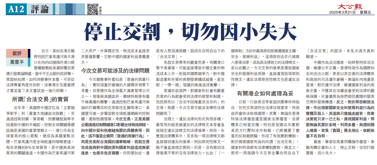 文章指出,今次拋售事件看似是“普通的商業行為”,實則須置於複雜的大國博弈背景下考量。貝萊德作為全球最大資產管理公司之一,背後與美國政府、總統特朗普有著千絲萬縷的聯繫。通過控制巴拿馬運河兩端的巴爾博亞和克里斯托瓦爾等港口,美國便可進一步鞏固對全球航運網絡的控制權,遏制他國發展。今次交易,正是美國企圖通過控制關鍵港口影響全球物流網絡、向中國外貿和供應鏈施壓的具體表現。因此,這不僅是企業間“普通的商業行為”,而是完美配合美國的遏華戰略。 文章提醒,有關港口售予美資後,可能直接導致中國企業的物流成本上升,削弱其國際競爭力,對中國製造業和外貿的長期發展構成威脅,甚至對“一帶一路”倡議的推進造成衝擊。 那麼,今次交易可能涉及哪些法律問題呢?文章分析,法理上,違反法律的形式有很多種,最常見的就是被違反的法律條文本身會直接規定違反該條文的法律後果。然而,在整個法律體系中,并非每一項法律條文都直接寫明違反的後果。例如原則性條文一般不會直接規定罰則。但是,沒有寫明法律後果不等於沒有法律效力。比如“‘一國兩制’方針的最高原則是維護國家主權、安全、發展利益”,這項原則去年已被寫入香港法律,成為具法律效力的法律條文。若以此觀之,今次交易的後果是導致國家安全和發展利益受損,直接違背該項原則性條文。違反法律原則性條文也是違反法律。 文章還表示,無論在香港特區法律層面還是國家法律層面,法律體系已相當完備。特別是我國近年應對美西方打壓和涉外制裁,已經積累了豐富的反制裁經驗,形成了有效應對機制。對於損害國家利益的所謂“合法交易”,國家和特區都有法律機制應對。最後,文章作者提出,從商業并購操作層面,奉勸有關企業和人士:停止交割,切勿打錯算盤、因小失大。(完) 【編輯:陳卓儀】