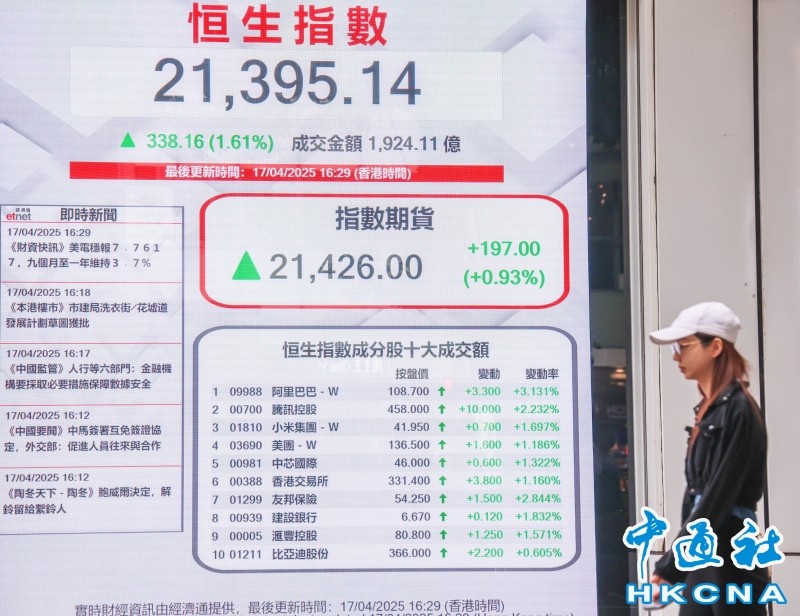 香港中通社圖片 當天,恒指高開9點,報21066點,曾倒跌17點,報21039點,之後掉頭向上,最多升360點,高見21417點。 國企指數報7897點,升118點;恆生科技指數報4887點,升91點。 有41隻股份曾創過52周新高或上市新高,包括赤峰黃金、山東黃金、泡泡瑪特、蜜雪集團、招金、SPDR金、萬國黃金集團等。 永豐金融集團研究部發布報告指出,美國對華輸美貨物徵收最高達245%關稅,大市午後一度下試,但當美方繼續以此失去威力的出招,對金融市場的震撼力大減。全球投資者亦感受到,關稅一事漸已消化潛在不明朗因素。 香港股票分析師協會副主席郭思治對中通社記者分析,美股大幅急跌,未對港股帶來影響,按照目前主要恒指成份股走勢看,短期後市下試機會不大。踏進下周,大市將受即月期指轉倉及結算等相關活動主導。(完) 【編輯:馬華】
