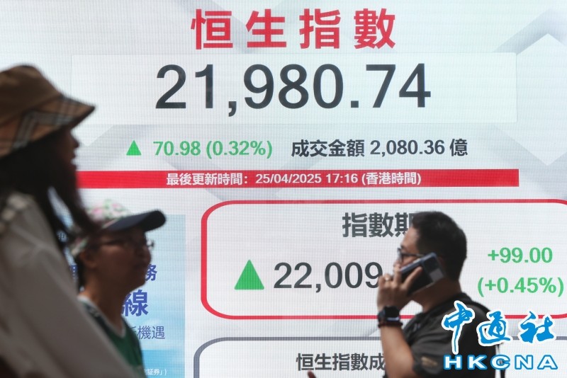 香港中通社4月25日電(記者 譚暢)中國稱美國應取消所有對華單邊關稅措施,並否認已展開貿易談判。市場繼續關注關稅戰反復。港股25日升,恒生指數收升70點或0.3%,報21980點,全周累計升幅2.7%或585點。大市全日成交約2080.4億港元。