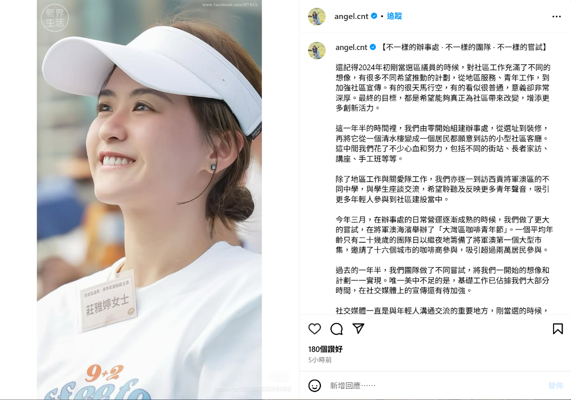 莊雅婷社交媒體截圖 據媒體報道,現年24歲的莊雅婷當日上午參加港姐首輪面試後,有記者問及是否從事模特兒,她否認但隨即笑顏逐開,並表示有朋友陪伴到場。 莊雅婷24日在社交平台表示,過去的一年半,她和團隊做了不同嘗試,將一開始的想像和計劃一一實現。唯一美中不足的是,基礎工作已佔據大部分,在社交媒體上的宣傳還有待加強。 莊雅婷指出,社交媒體一直是與年輕人溝通交流的重要地方,剛當選的時候,都希望可以善用網路平台,讓更多人了解區議員的日常工作,吸引更多年輕人關注社區,成為特區政府同年輕人之間的橋樑。 所以,接下來希望嘗試新的方式,搭建新的平台,更全面地向大家分享工作成果,繼續做好區議員工作,做好青年工作,服務社區。 她最後鼓勵,表示雖然不知道會不會成功,但年輕人就是要敢試敢創新。她說希望大家多多支持,手下留情。 據莊雅婷社交媒體介紹,她本科於2023年從北京大學畢業,碩士於2025年從香港大學畢業,將於今年9月入讀清華大學博士課程。 (完) 【編輯:梁嘉軒】