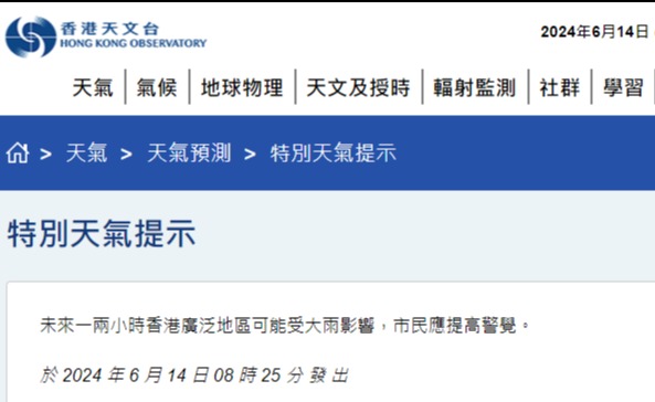 1、香港9日大致多雲,有幾陣驟雨及雷暴,驟雨逐漸增多。日間短暫時間有陽光及酷熱。最高氣溫約33度。吹和緩西南風。展望明日及星期五有大驟雨及狂風雷暴。星期六天氣仍然不穩定。下週初驟雨逐漸減少。